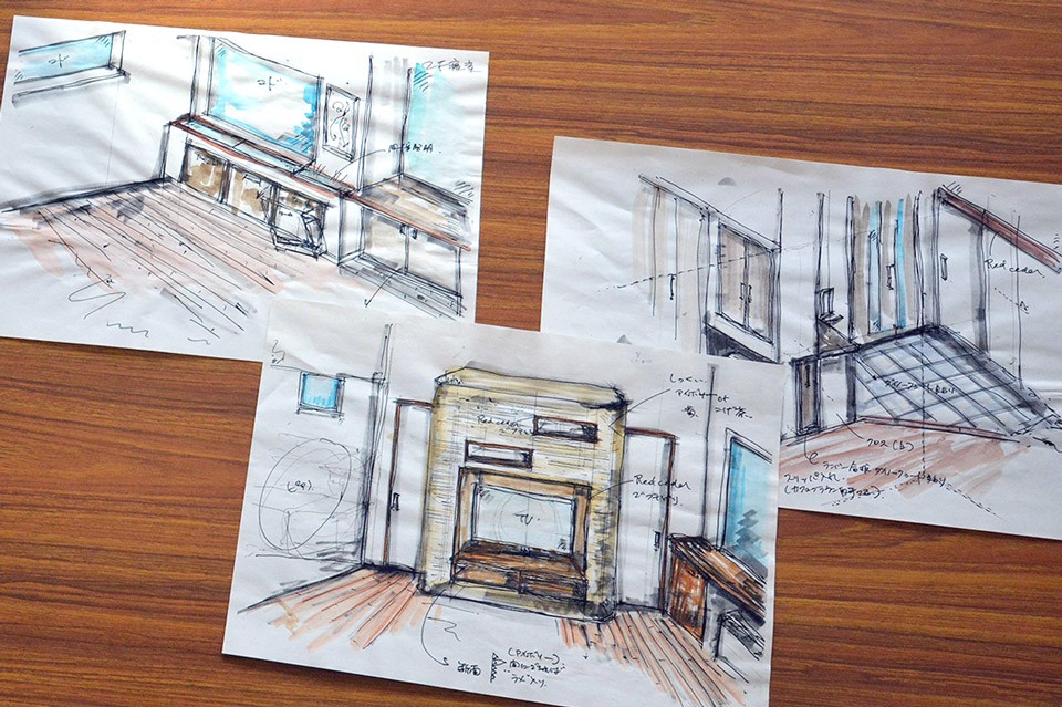 家族のコミュニケーションなどを踏まえた階段の位置や、収納やテレビボードなどの大きさや色などは図面だけではなかなかイメージしにくいものです。オープンハウスを見て頂いたり、手書きのスケッチなどを見て頂くなど、できるだけ具体的にイメージできるようにしています。